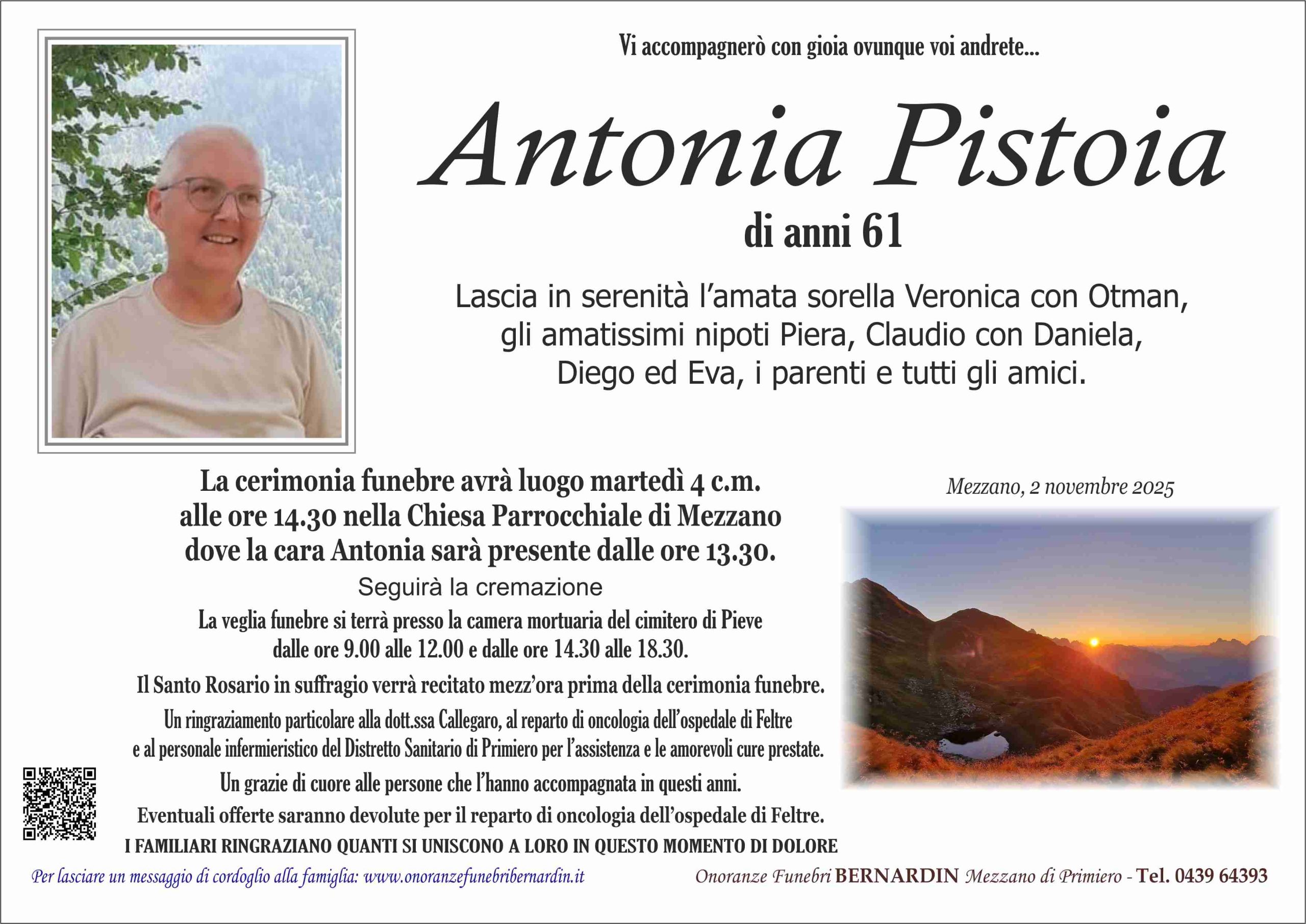 La cerimonia funebre avrà luogo martedì 4 c.m. alle ore 14.30 nella Chiesa Parrocchiale di Mezzano dove la cara Antonia sarà presente dalle ore 13.30.