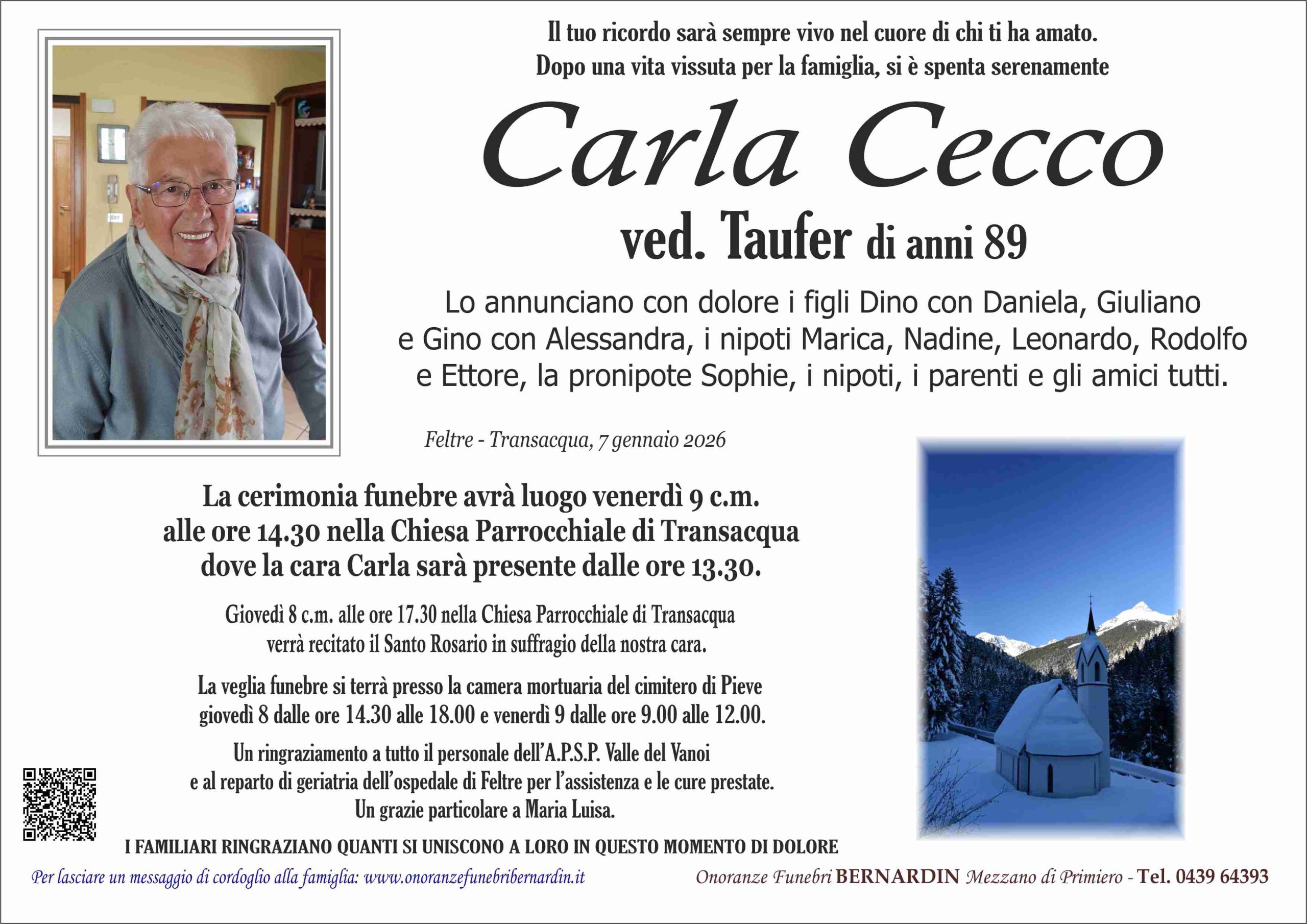 La cerimonia funebre avrà luogo venerdì 9 c.m. alle ore 14.30 nella Chiesa Parrocchiale di Transacqua dove la cara Carla sarà presente dalle ore 13.30.
