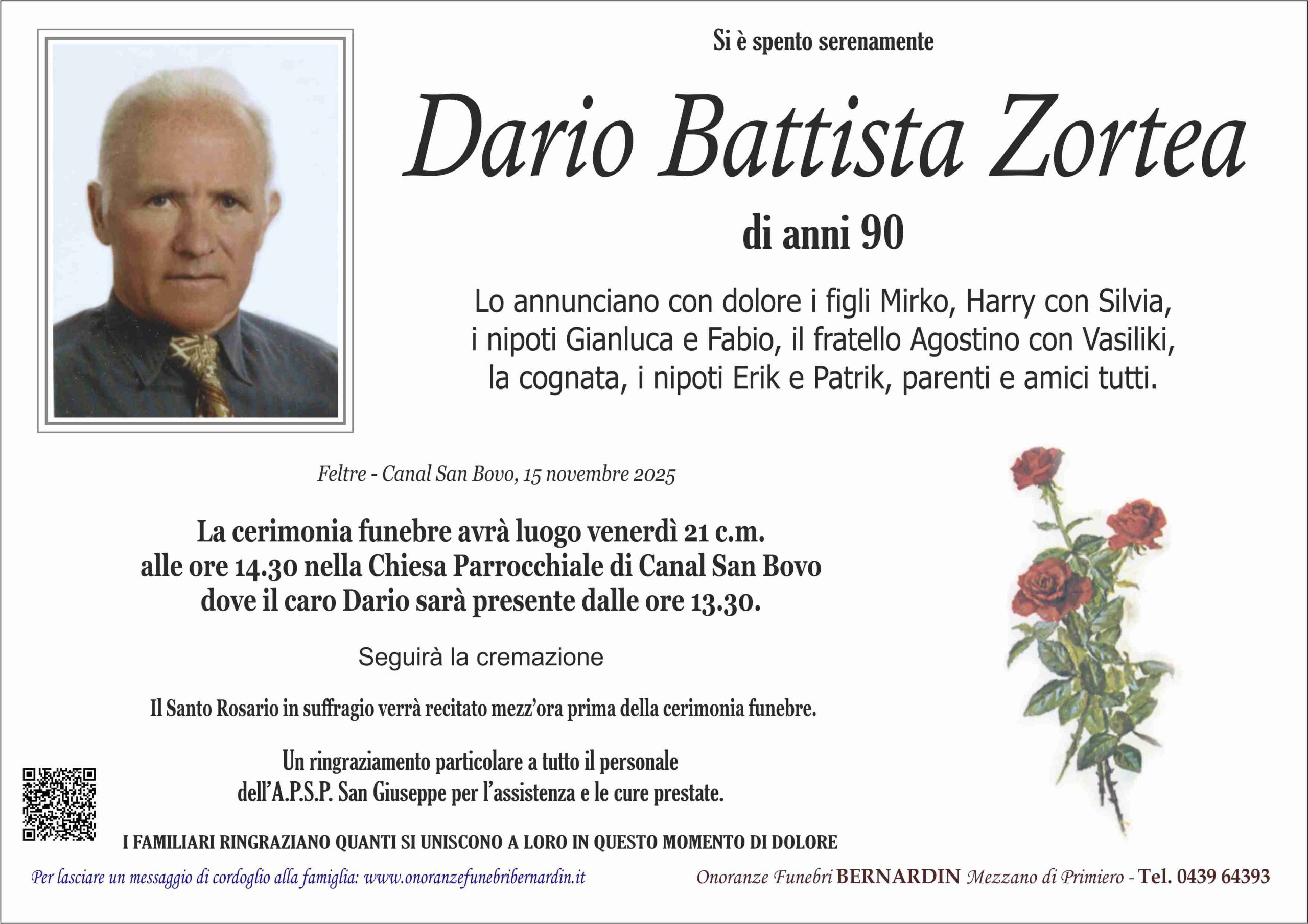 La cerimonia funebre avrà luogo venerdì 21 c.m. alle ore 14.30 nella Chiesa Parrocchiale di Canal San Bovo dove il caro Dario sarà presente dalle ore 13.30.
