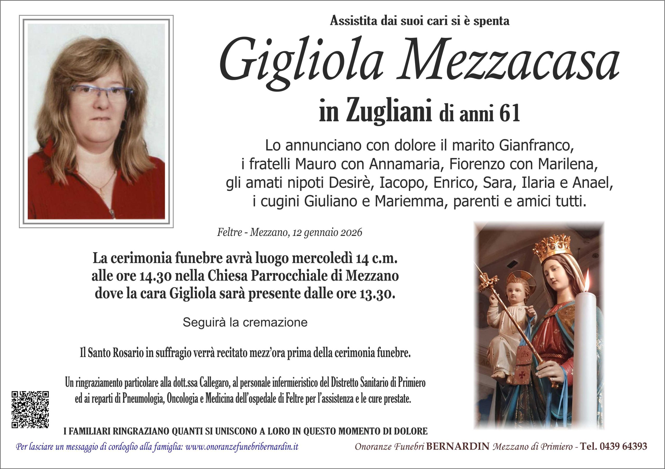 La cerimonia funebre avrà luogo mercoledì 14 c.m. alle ore 14.30 nella Chiesa Parrocchiale di Mezzano dove la cara Gigliola sarà presente dalle ore 13.30.