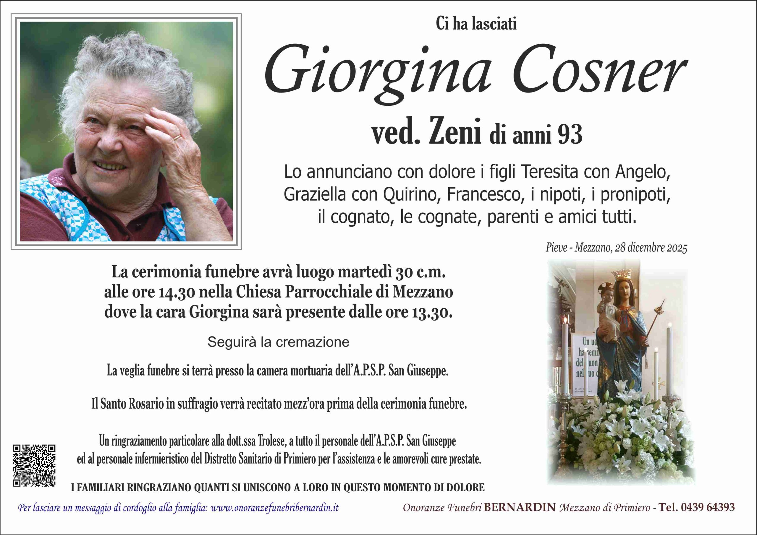 La cerimonia funebre avrà luogo martedì 30 c.m. alle ore 14.30 nella Chiesa Parrocchiale di Mezzano dove la cara Giorgina sarà presente dalle ore 13.30.