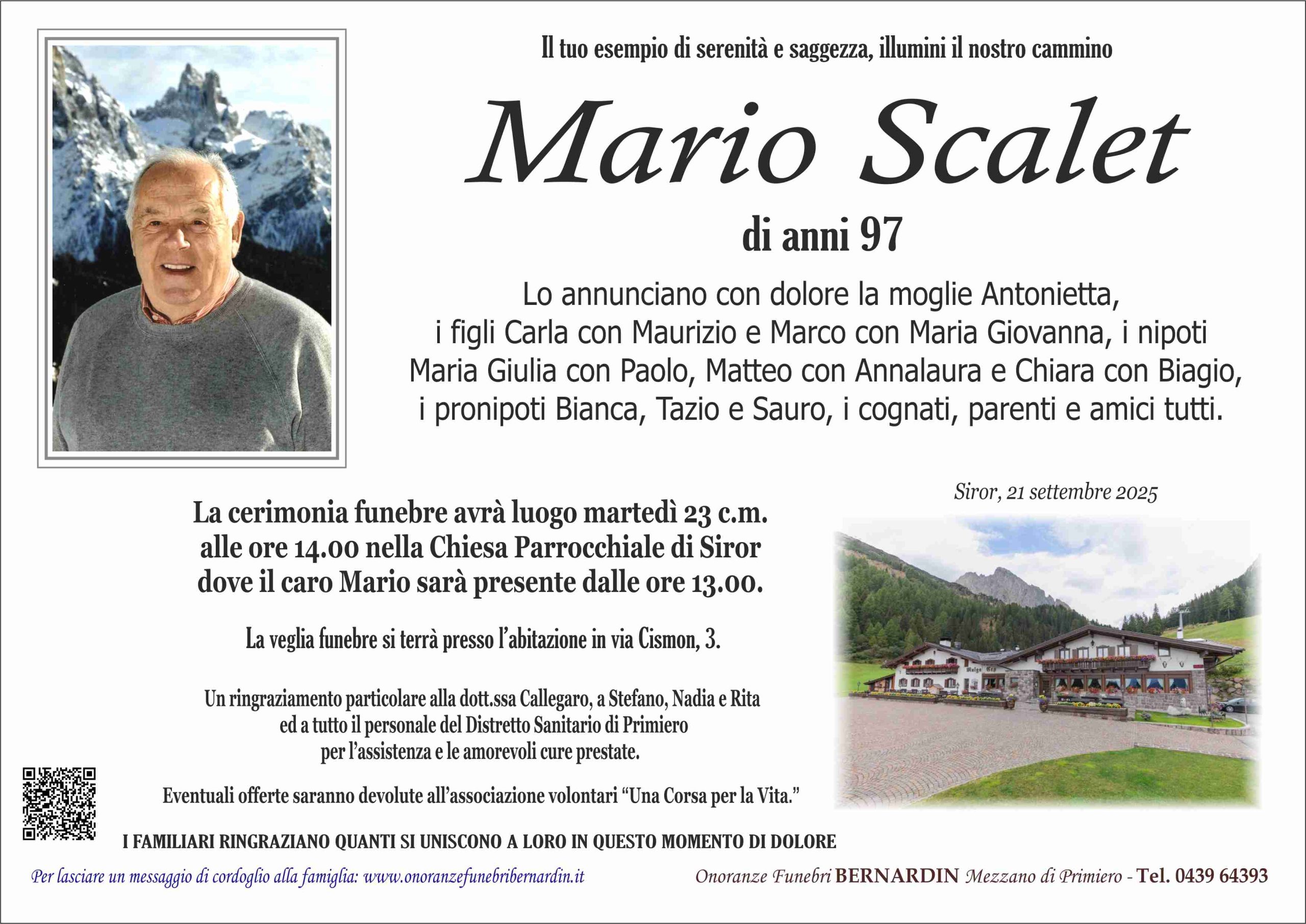 La cerimonia funebre avrà luogo martedì 23 c.m. alle ore 14.00 nella Chiesa Parrocchiale di Siror dove il caro Mario sarà presente dalle ore 13.00.