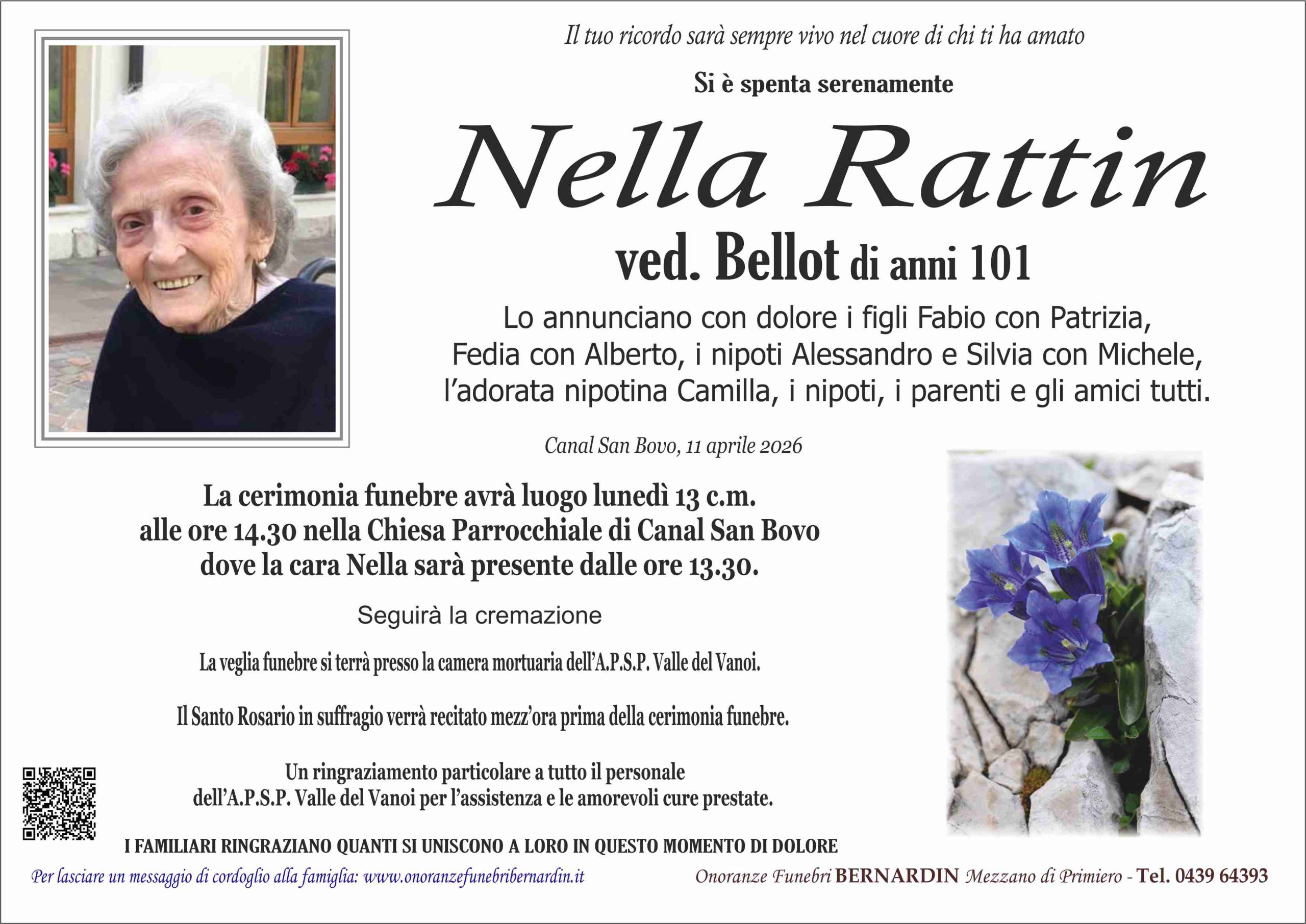 La cerimonia funebre avrà luogo lunedì 13 c.m. alle ore 14.30 nella Chiesa Parrocchiale di Canal San Bovo dove la cara Nella sarà presente dalle ore 13.30.