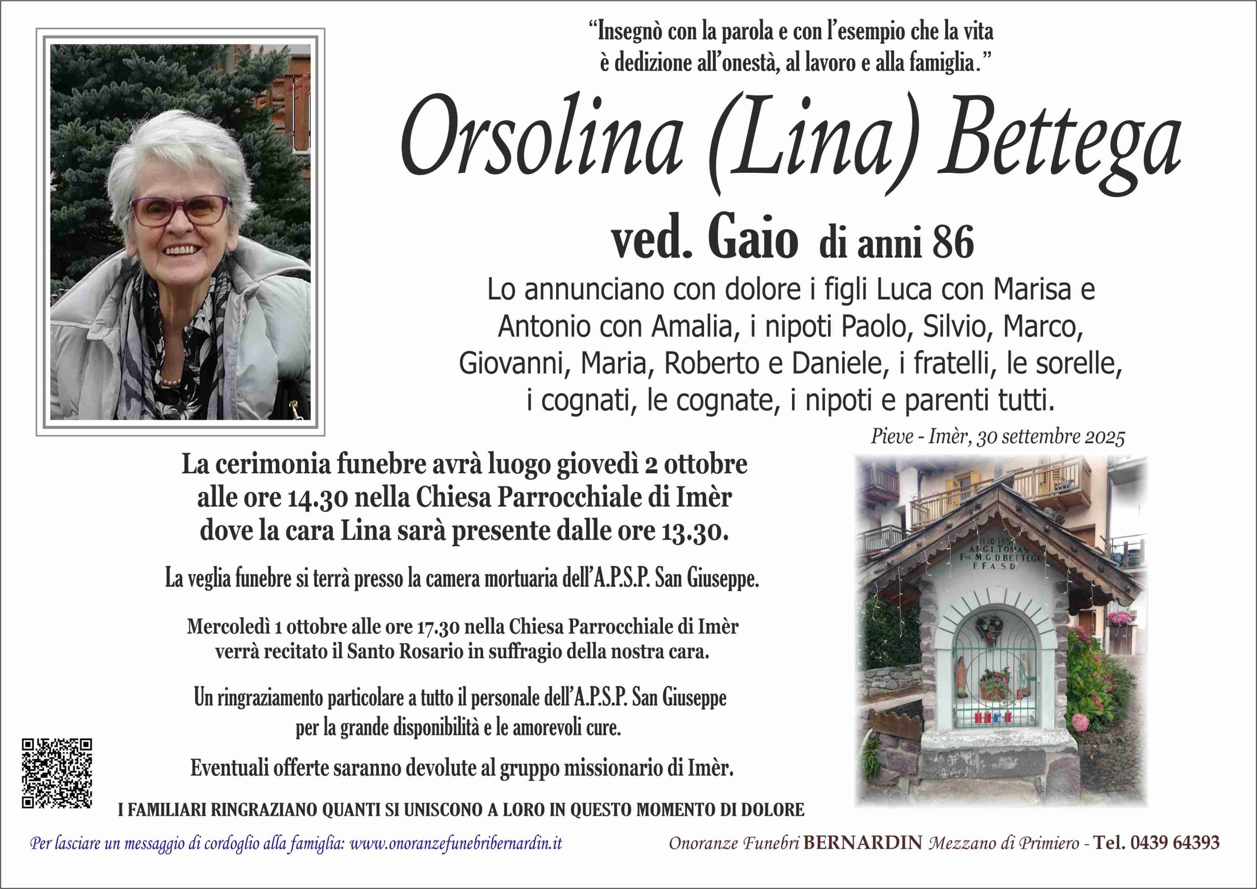 La cerimonia funebre avrà luogo giovedì 2 ottobre alle ore 14.30 nella Chiesa Parrocchiale di Imèr dove la cara Lina sarà presente dalle ore 13.30.