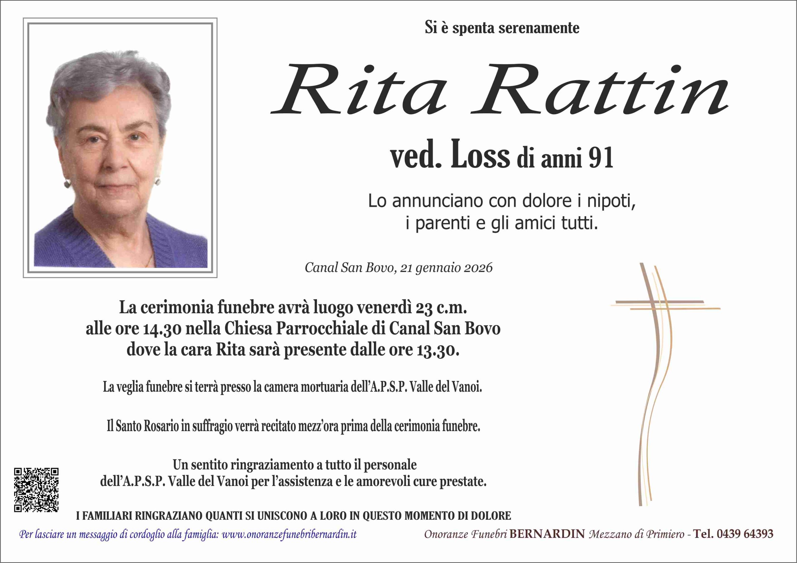 La cerimonia funebre avrà luogo venerdì 23 c.m. alle ore 14.30 nella Chiesa Parrocchiale di Canal San Bovo dove la cara Rita sarà presente dalle ore 13.30.
