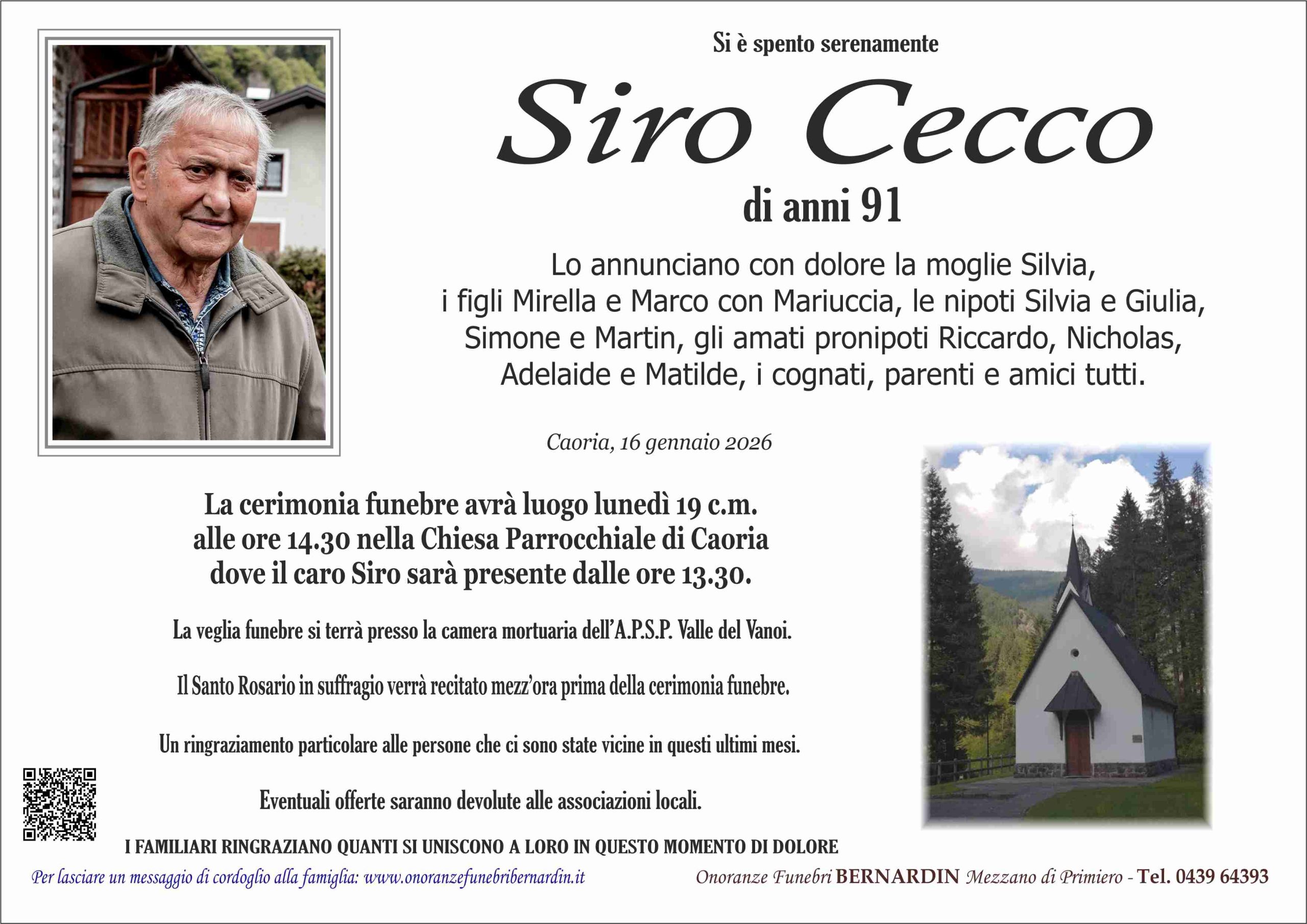 La cerimonia funebre avrà luogo lunedì 19 c.m. alle ore 14.30 nella Chiesa Parrocchiale di Caoria dove il caro Siro sarà presente dalle ore 13.30.