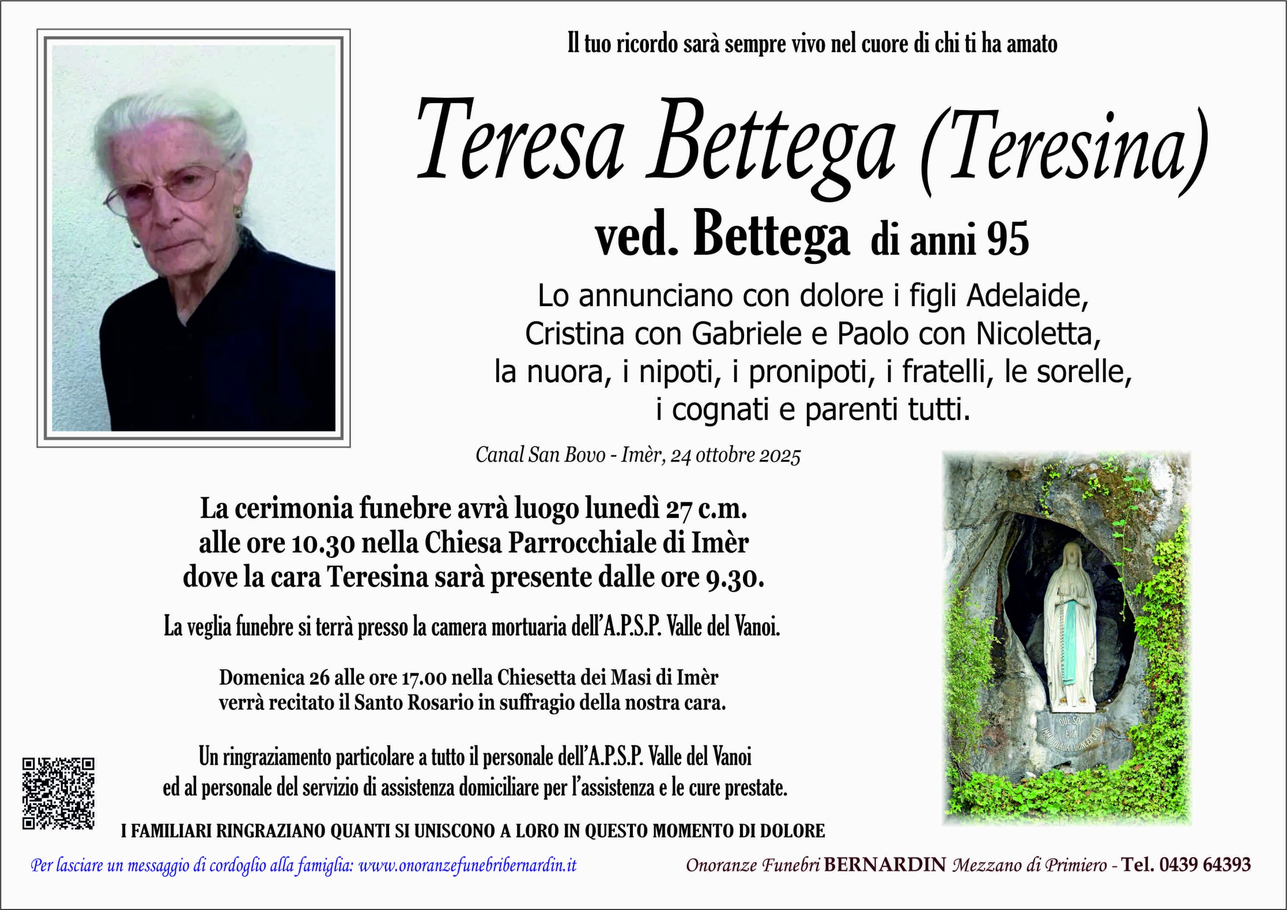 La cerimonia funebre avrà luogo lunedì 27 c.m. alle ore 10.30 nella Chiesa Parrocchiale di Imèr dove la cara Teresina sarà presente dalle ore 9.30.